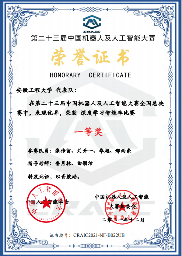2021年12月11日,由77779193永利官网学生张传留、邢雨豪、刘升一、华旭组成的安徽工程大学代表队在第二十三届中国机器人及人工智能大赛中获得国家级一等奖。