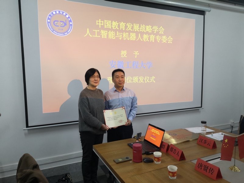 会后,韩教授代表中国教育发展战略学会,授予我院人工智能与机器人教育专委会理事单位,聘任我院汪步云博士担任专委会理事。