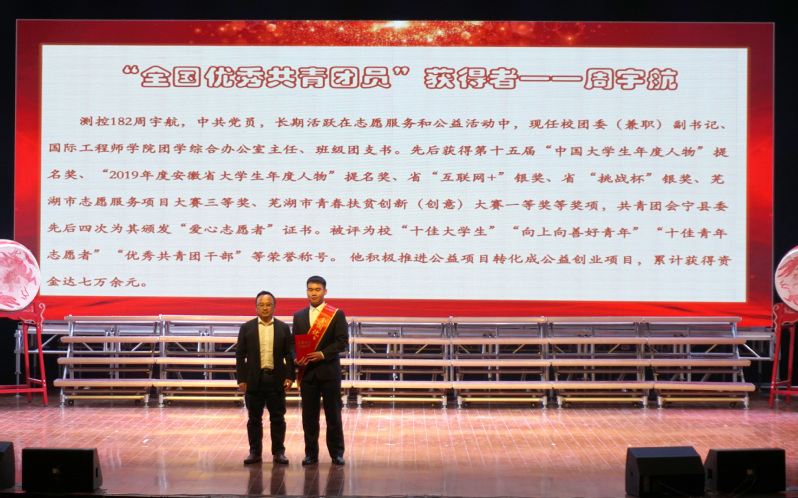 现场大屏幕一一展示了自立自强、不负青春,将青春浸满奋斗汗水的“中国大学生自强之星”李增产;团学工作强锻炼,志愿服务展风采,于创新中进取,担当勇作为的“全国优秀共青团员”周宇航;坚持“清朗网络空间”的新时代道德示范青年、 校“十佳大学生”潘颢;创新引领发展,科技塑造未来,以赛促学,自强不息的学科竞赛获奖代表机器人张帅等人;班风优良,作风过硬,学风浓厚,互助友爱,众志成城,共同创造班集体辉煌的机电192等先进班集体;学思至深,精神浩瀚,用行动突破自我,用行动诠释优秀的陈思琦等国家奖学金获得者以及“三好学生标兵”、“学生干部标兵”、“科技活动标兵”、“社会活动标兵”。获奖学生和班集体的先进事迹给现场观众留下了深刻印象,赢得阵阵掌声。在响彻全场的掌声中,与会领导为先进集体、先进个人颁发荣誉证书。