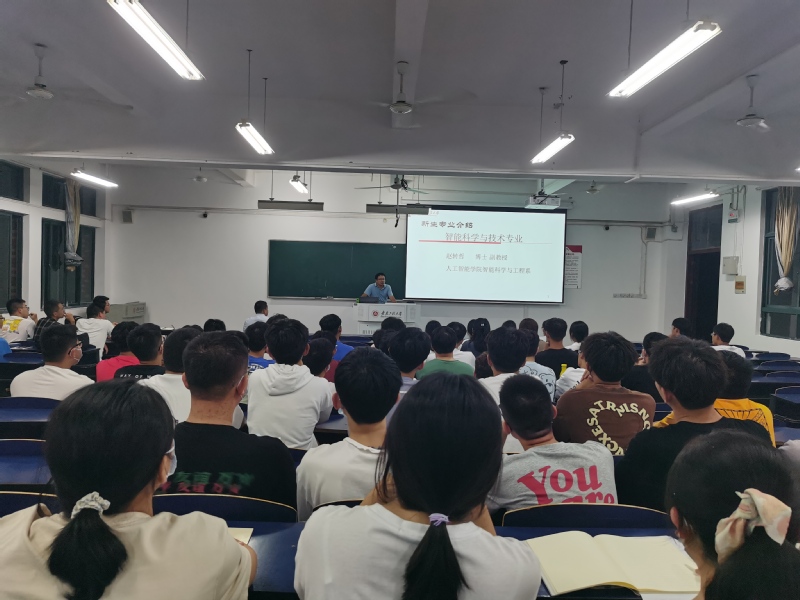 同时,赵老师向同学们详细介绍了我院目前的科研平台建设情况,包括深度学习实验室、人机自然交互实验室、机器视觉实验室等,列举了自智能科学与技术专业建设以来,我系师生取得的一系列科研成果和学科竞赛获奖情况,进一步增加了同学们的专业认同感。此外,赵老师还向同学们逐一介绍了我系到场所有专业授课老师,受到了同学们的热烈欢迎。