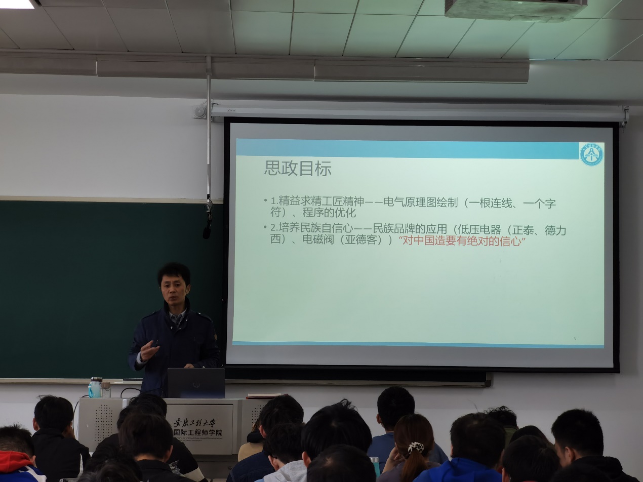 苏学满为学院教学督导组组长,现主持省级教学示范课1门,校级教研项目1项,多次指导学生获得省级学科竞赛一等奖。本次示范课主要为“外围设备PLC控制”部分的内容,教学内容涉及PLC选型、电气原理图、控制程序设计和PLC通信四个方面。苏老师在对上次课教学内容简单回顾的基础上,介绍了本节课的教学目标和思政目标。以工业机器人控制图和PLC实际应用中遇到的问题为切入点引入本节的教学内容,教学过程中以实际工厂生产实践为例,教授课程的知识点,理论结合实际,解决实践问题,很好地激发了学生的学习兴趣,增强学生对于知识的理解程度,达到了较好的教书育人效果。获得了观摩领导和老师的一致好评。