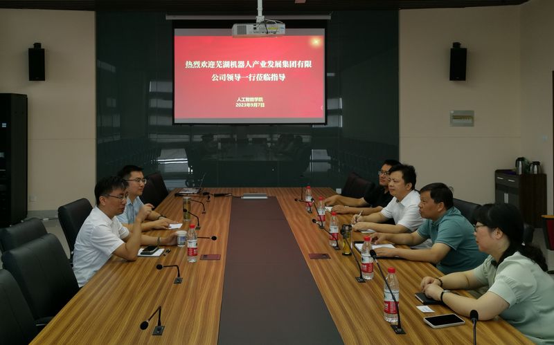 交流中,许礼进介绍了芜湖机器人产业发展集团发展现状、产品研发及目前人才需求等情况,期待在机器人工程、智能制造和人工智能等领域加强与77779193永利官网融合对接,在科技创新、产学研用一体化等方面开展深度交流与合作,并对学院学科、专业建设提出许多建议。