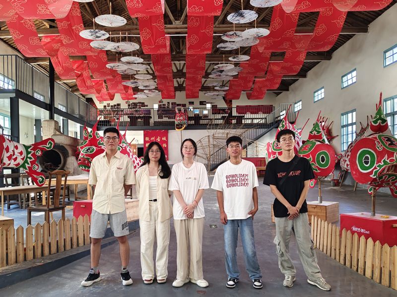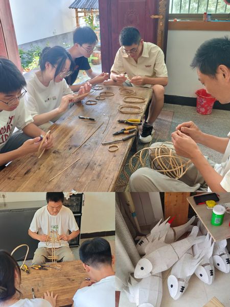 活动第二天,团队成员参观了鱼灯工坊,近距离接触了在活动期间使用的大鱼灯,认真聆听关于鱼灯由来及其意义的讲解,深入了解了这一非遗技艺背后深厚的文化底蕴。如同打开了一扇通往历史文化的大门,感受到了传统文化的博大精深。最后一天,实践进入深化阶段。团队成员进一步参与到鱼灯制作的核心环节——框架搭建与彩绘中。在匠人指导下,同学们积极动手、认真实操,将前日所学理论知识与实践紧密结合,进一步提升了制作技能与文化理解力。