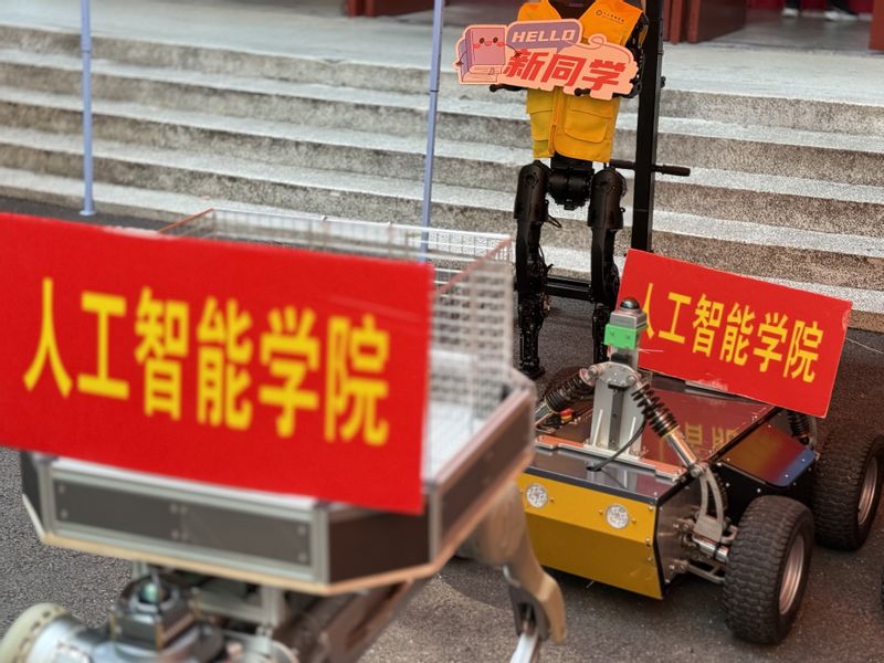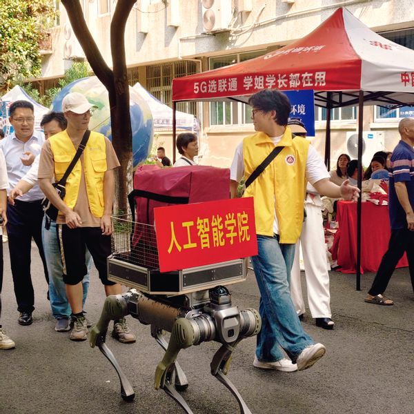 学院创新引入机器狗“小智”运送行李服务与机器人R2展示。机器狗“小智”高效协助新生搬运行李,吸引众多新生及家长驻足观看。上下楼梯、规避识别障碍物、负重运输,一系列操作让新同学们直观感受前沿科技带来的无穷魅力,对所学专业有了直观而生动的初印象。机器人R2是校企合作研发的一款小尺寸人形机器人,具备优秀的运动能力,可执行高难度,复杂动作。多方位的展示,身临其境的体验,引导新生在科技氛围中开启大学新生活。
