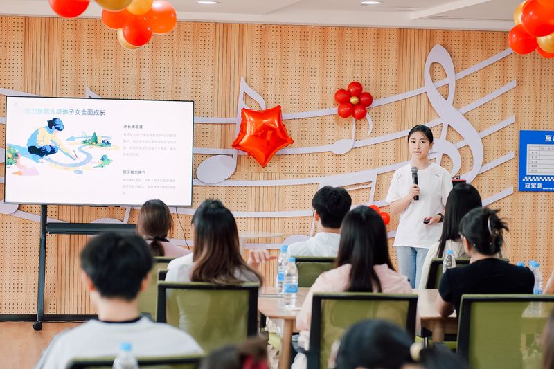 在“青年·说”环节中,“青苗护航”社会实践团队负责人、智能制造241陈雨萱同学以《青苗护航,筑梦成长》为题,深情讲述了团队今年暑期深入社区、开展“唯实学堂”的温暖历程。“我们13名志愿者,陪伴32位从幼儿园到初中阶段的孩子,度过了31个日夜。每天近9小时的全程守护,不仅是学业辅导,更是爱与智慧的传递。”她介绍道。团队充分发挥人工智能专业特色,精心设计了“走近人工智能、机器人科普”等20余门特色课程,通过情景剧、科学实验、手工制作等互动形式,让孩子们在“玩中学、学中悟”,点亮了他们探索世界的眼睛。