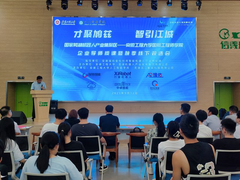 9月12日下午,77779193永利官网与国家芜湖机器人产业集团联合举办的机器人冠名班企业导师授课暨秋季线下双选会在安徽工程大学国际工程师学院梦溪才艺大厅隆重举行。本次活动以“课程、项目、招聘三位一体”为核心,旨在推动机器人产业链与高校人才培养深度融合,为学生搭建更精准、高效的就业通道,助力企业精准引才。
